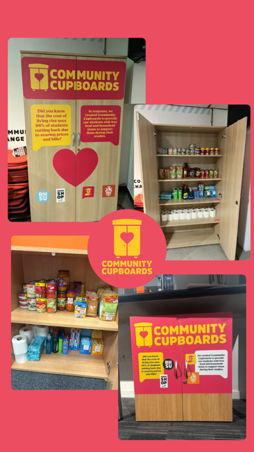 ‘Community Cupboards’ - pantry-style cupboards filled with non-perishable food and household goods, stocked by campus shops, and the University, which students have free and unlimited access to. There are now four cupboards on are Egham campus in Tommy’s Lounge in the SU Building, Windsor Student Lounge, Wettons Student Lounge and in the Shilling Student Lounge.