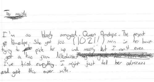 The third drew on modern adaptations of Telemachus’ narrative to reinterpret his reunion with Odysseus. We read more extracts from Claire North’s Ithaca trilogy, first exploring a crisis of masculinity in Telemachus, who was raised exclusively by women, and then exploring the awkward dynamics of Odysseus’ return. This provoked questions about what pressures young men face growing up, how long it takes to get to know someone, and whether Telemachus should treat his long-absent father with any reverence. Finally, we used script-writing (and in some cases, dramatic performances!) to explore the initial reunion of Odysseus and Telemachus.